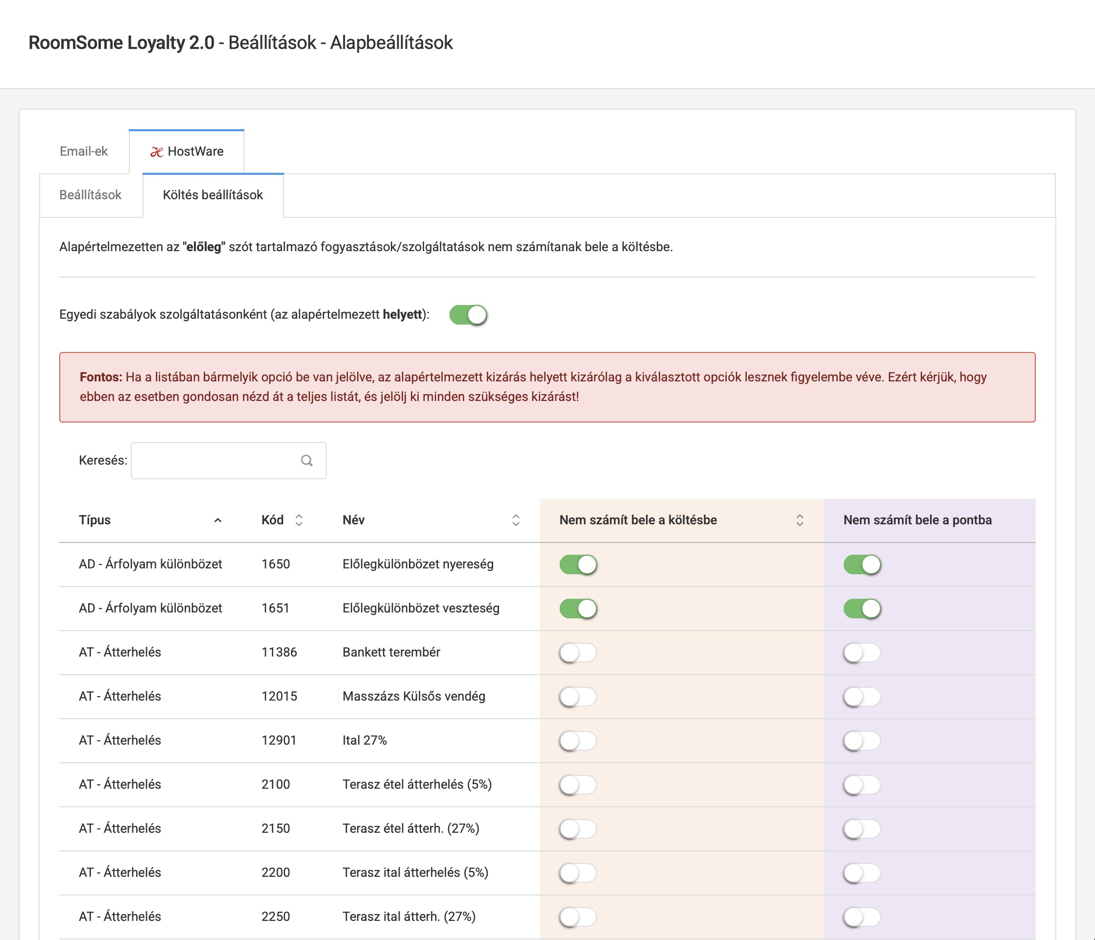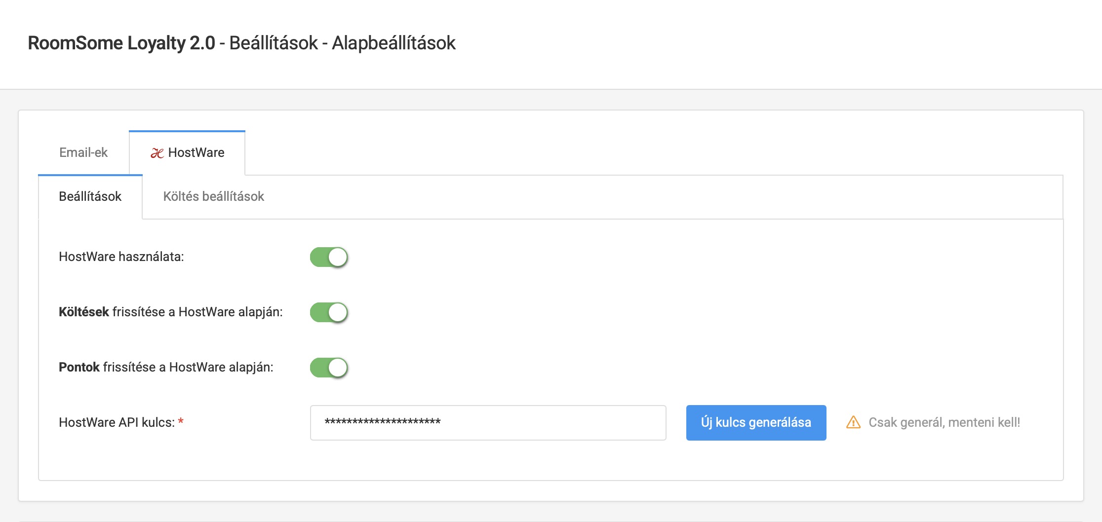 RoomSome Loyalty 2.0 → Beállítások → Alapbeállítások → HostWare fül